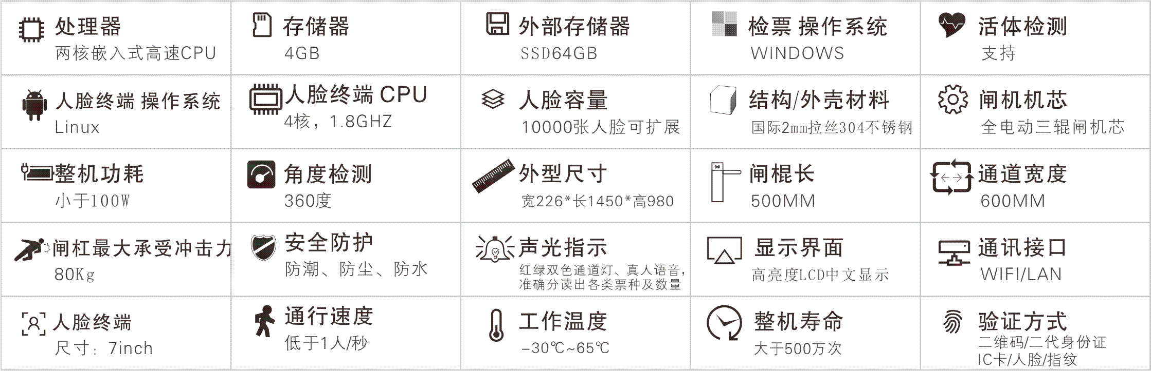 ARM內(nèi)核微處理器(ARM內(nèi)核,可迅速達(dá)到客戶的個(gè)性化功能要求);整機(jī)無(wú)棱角設(shè)計(jì),防止意外碰撞時(shí)對(duì)人身的傷害,確保行人通行安全;全不銹鋼外殼、機(jī)箱部構(gòu)件采用全部防腐處理,經(jīng)久耐用;易控制,好維護(hù),方便管理;兼容主流讀卡器或識(shí)別系統(tǒng);人員通行速度約20人/分鐘(正常) 30人/分鐘(快速),可單向或雙向通行;真正意義上的TCP/IP